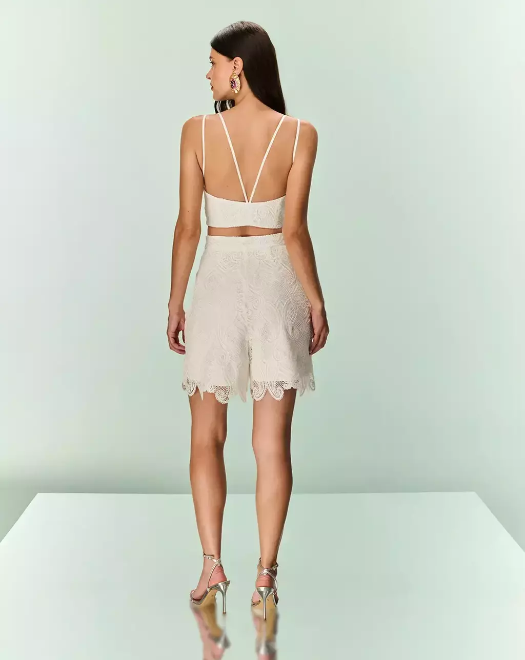 Conjunto produzido em renda Guippir, considerada umas das rendas mais nobres e versáteis. Exibe top com modelagem corset e alças duplas, enquanto sua bermuda tem cintura alta e bolsos funcionais.