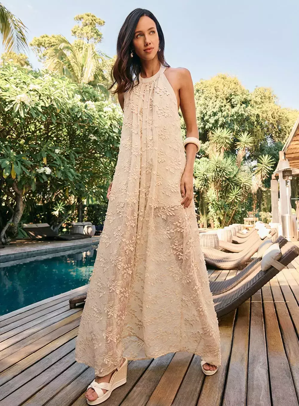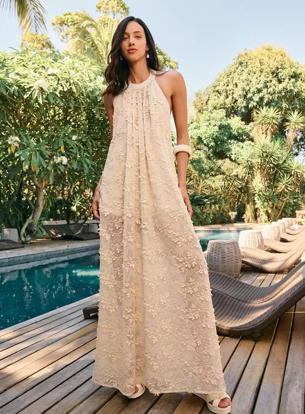 Vestido feito em tecido de chiffon com aplicação de folhas 3D. Apresenta comprimento longo, modelagem ampla e fluída e alças com amarração no pescoço. Faixa acompanha a peça. O tecido leve e fluído cai graciosamente pelo corpo e os detalhes em bordado trazem um toque romântico e feminino. Combine com sandálias rasteiras e uma bolsa de crochê para um visual despojado e chic! Summer Breeze: Detalhes sutis e acabamentos finos trazem um charme extra, tornando cada peça única. Seja para um passeio à beira-mar ou um almoço ao pôr do sol, a coleção Resort é a escolha ideal para a mulher que deseja se sentir confiante e radiante em qualquer ocasião, com a leveza e o glamour que o verão pede.