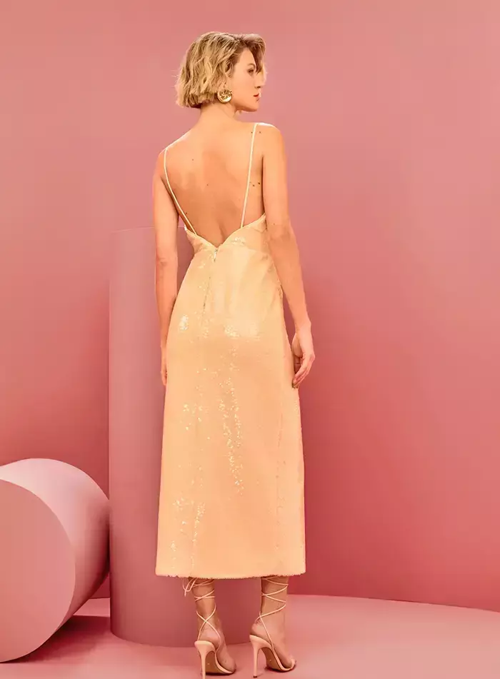 Vestido produzido em tecido bordado de paetês. Exibe comprimento midi, decote em “V”, alças finas, fenda na frente e fechamento por zíper invisível atrás.
